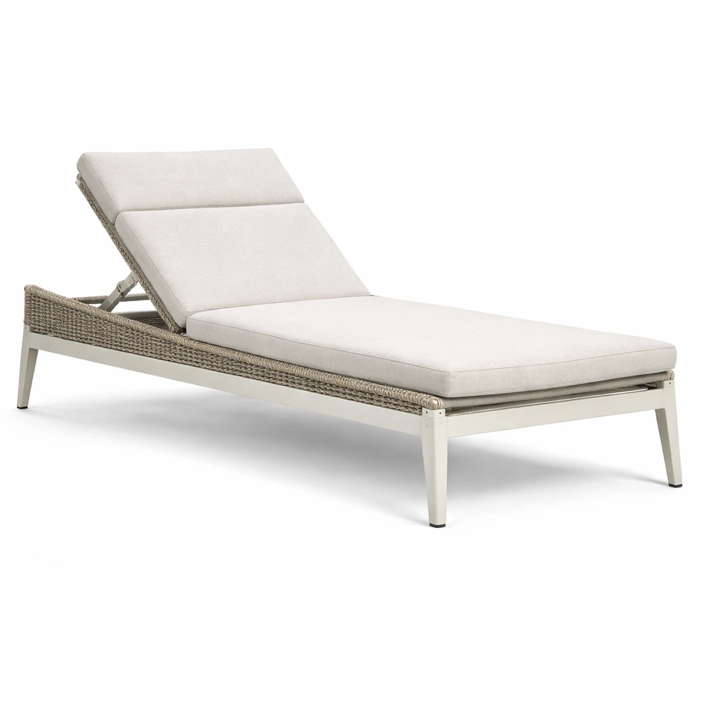 Sillón de aluminio con cojines gris claro y cuerda trenzada